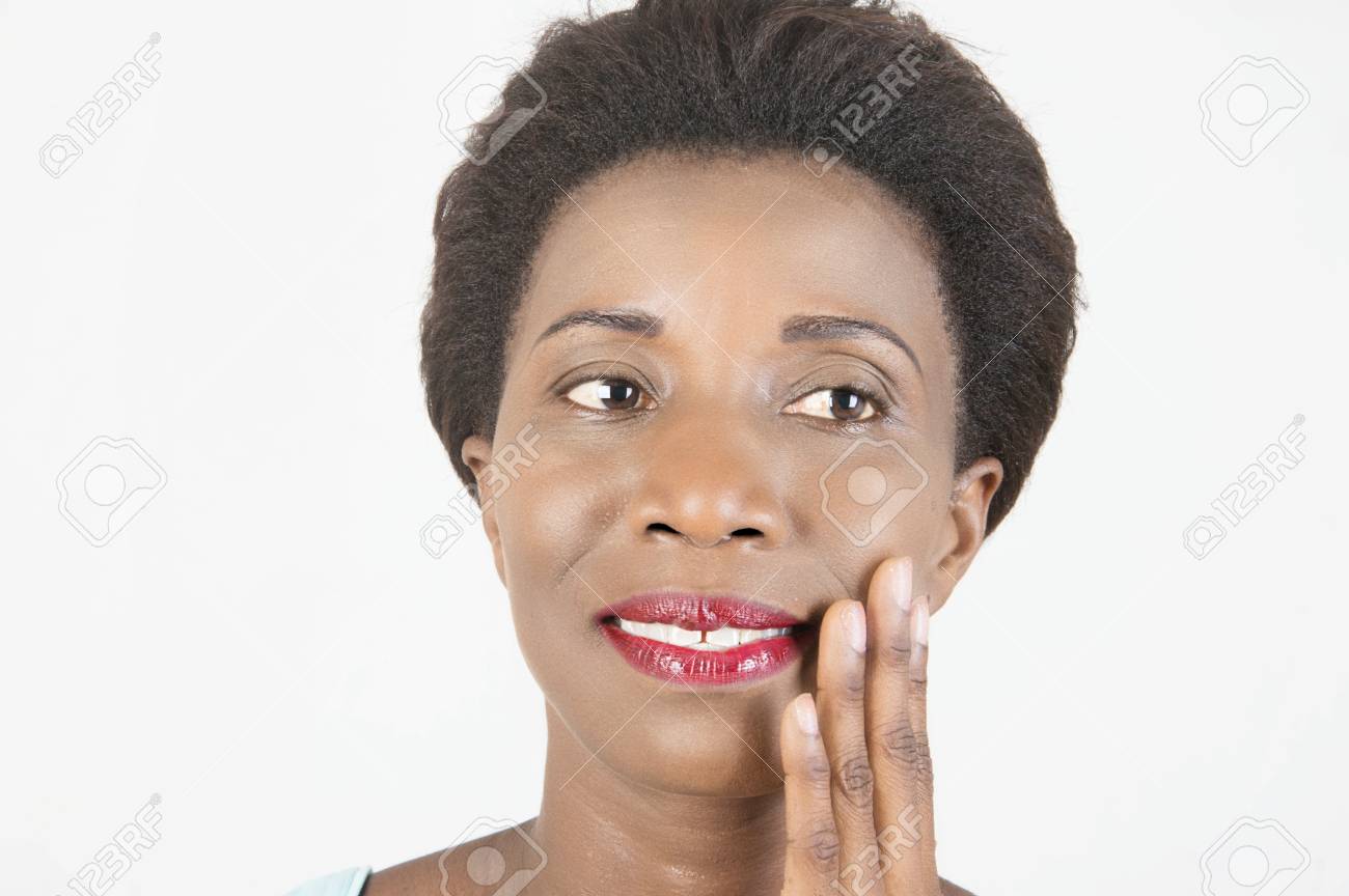 彼女の顔をなでるこの笑顔の若い女性は 彼女の肌の美しさを高く評価します の写真素材 画像素材 Image